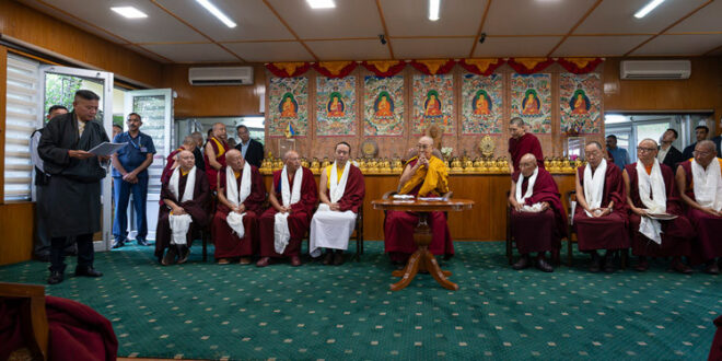His Holiness the Dalai Lama meeting with delegates to the 15th Tibetan Religious Leaders Meeting at the meeting hall at his residence in Dharamshala, HP, India on 4 July 2025. Photo by Tenzin Choejor